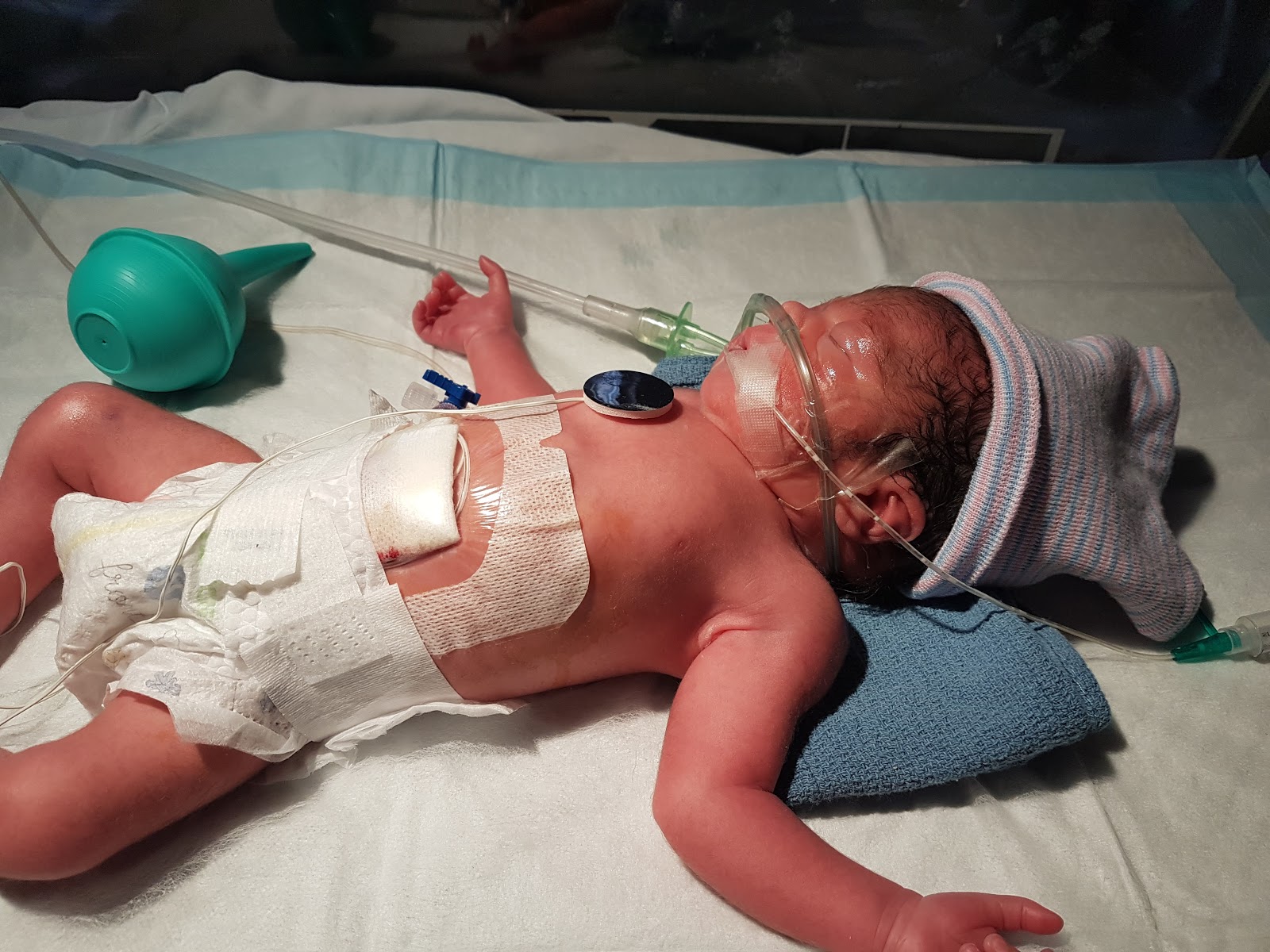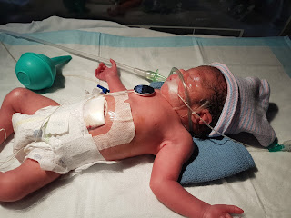 We whisked mom off to the operating room, gave her some conscious sedation, and had that baby out in about 3 minutes flat. The docs handed a tiny, lifeless baby "Z" to me and I quickly carried his little body out the door of the OR to the newborn warmer where our team of docs was already waiting to resuscitate him. It was only a matter of minutes before he was breathing on his own with the help of our makeshift bubble CPAP and was pinking up quickly. He even gave a few weak wails when we disturbed him. He wasn't out of the woods yet but was doing awesome!